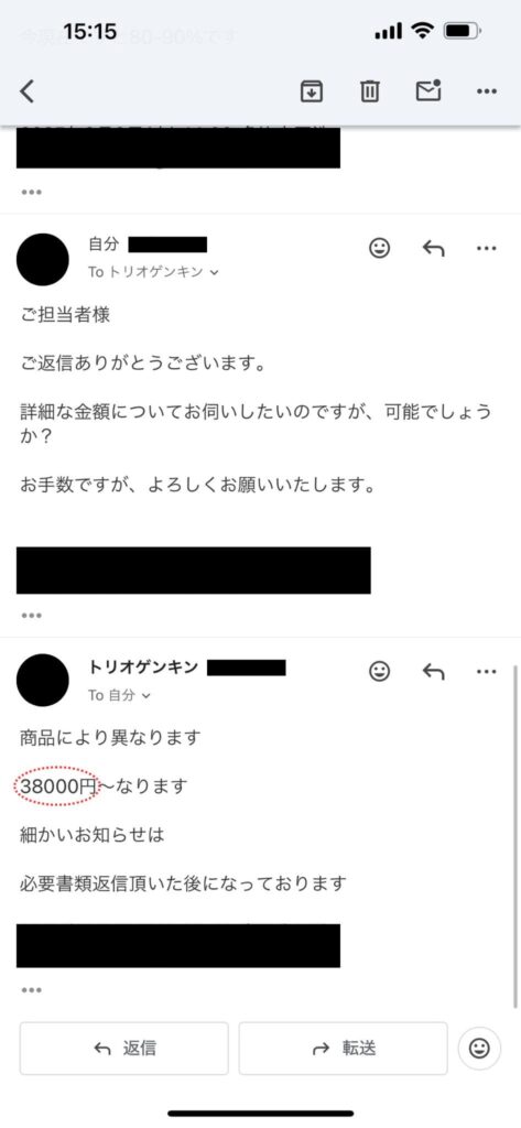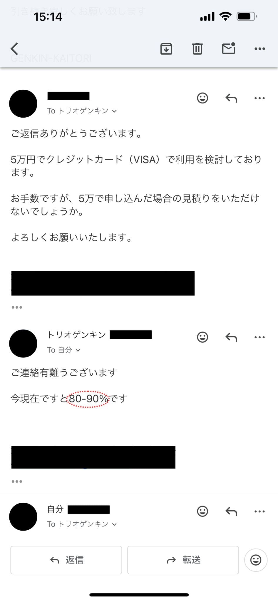 GENKINKA ITORIを利用してみたところ、50,000円の申し込みに対して受け取れた金額は38,000円で、換金率はわずか76%にとどまりました。
