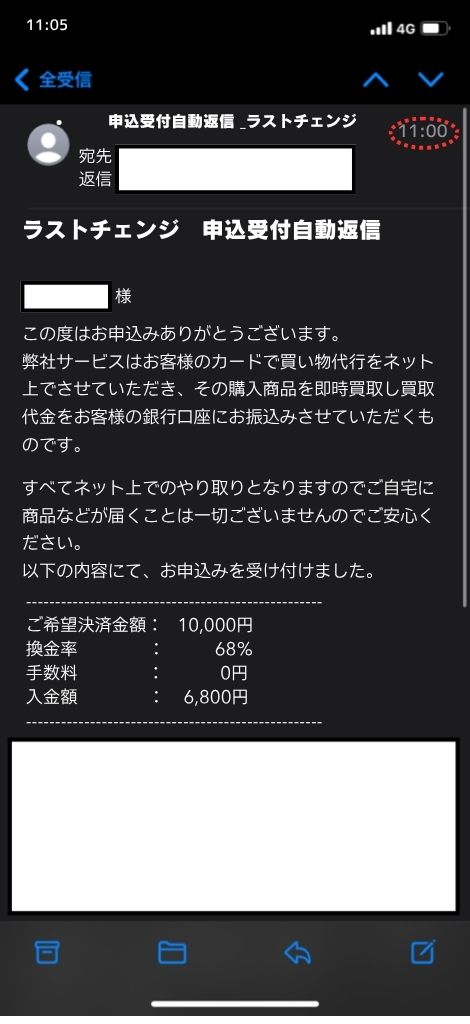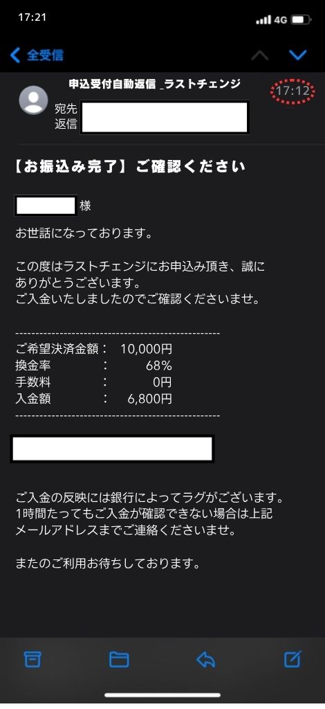 ラストチェンジを利用してみたところ、10,000円の申し込みに対して受け取れた金額は6,800円と、換金率はわずか68%にとどまりました。