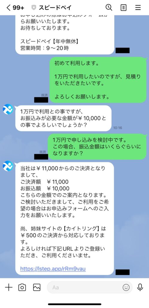 スピードペイを利用してみたところ、11,000円の申し込みに対して受け取れた金額は10,000円で、換金率は約90%でした。